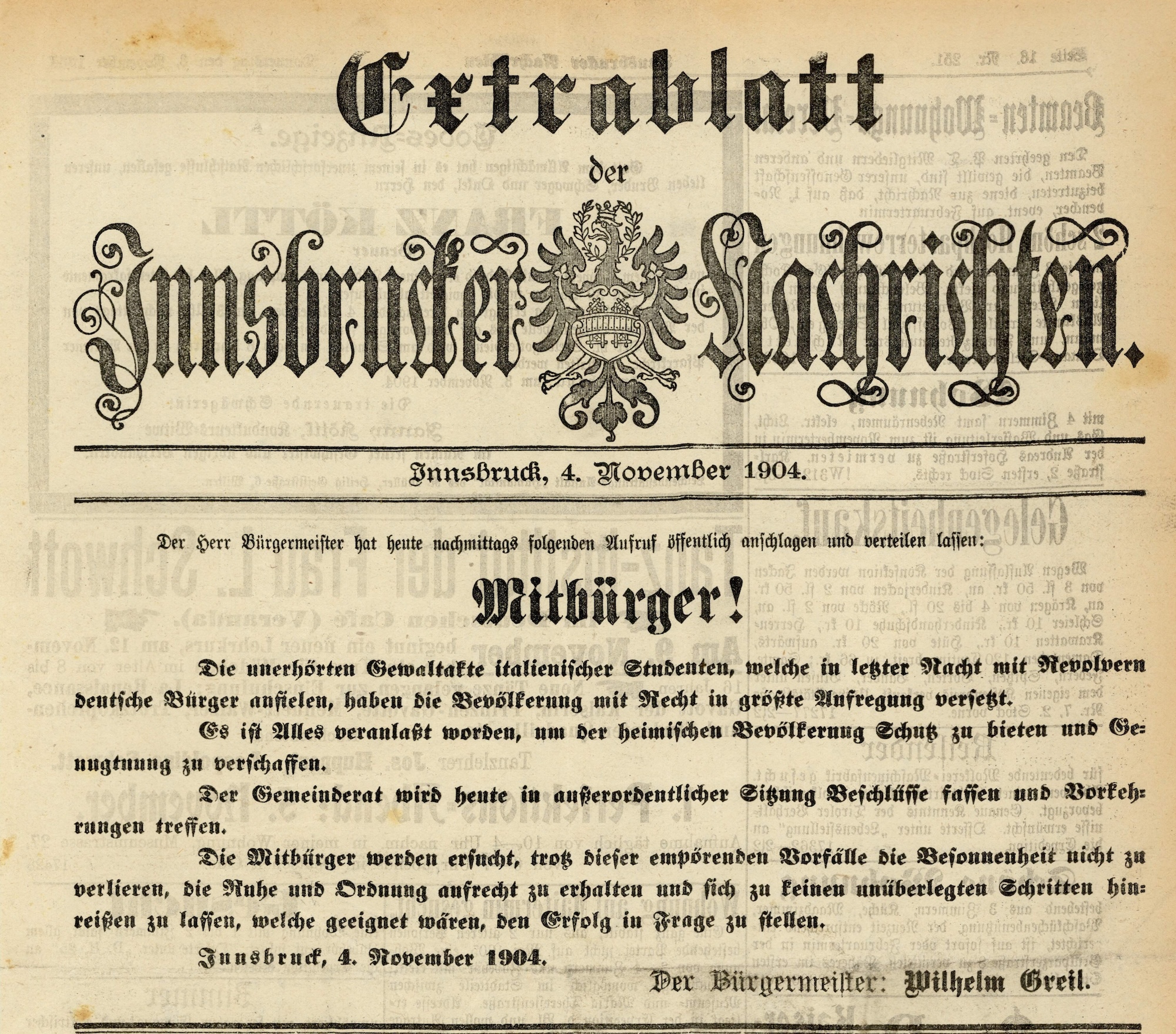 Der deutschnationale/deutschfreiheitliche Wilhelm Greil (1850–1928) bekleidete seit 1896/97 das Amt des Bürgermeisters von Innsbruck. In seine Amtszeit fallen große Infrastrukturprojekte und ein rasches Bevölkerungswachstum. Greil war wie die meisten Vertreter der Innsbrucker Stadtpolitik gegen die Eröffnung der italienischen Rechtsfakultät. Schon im Jahr zuvor hatte er sich gegen die Schaffung weiterer italienischer Lehrstühle an der Universität ausgesprochen, da aus seiner Sicht nur „eine Hochschule von rein nationalem Charakter […] eine Zukunft“ habe. Außerdem warnte er vor dem Zuzug von Italienern nach Innsbruck, weil dieser eine Gefahr für das „Deutschtum“ der Stadt bedeute.